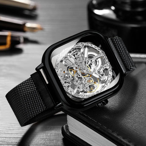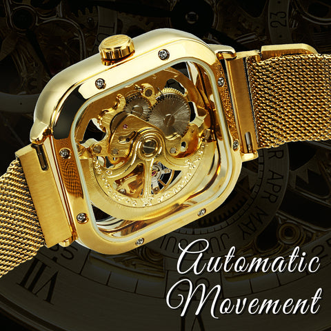 Vintage Gold Square Skeleton Automatic Mechanical Watch Engraving Movement Unisex Winding Watches for Men Stainless Steel Strap Forsining